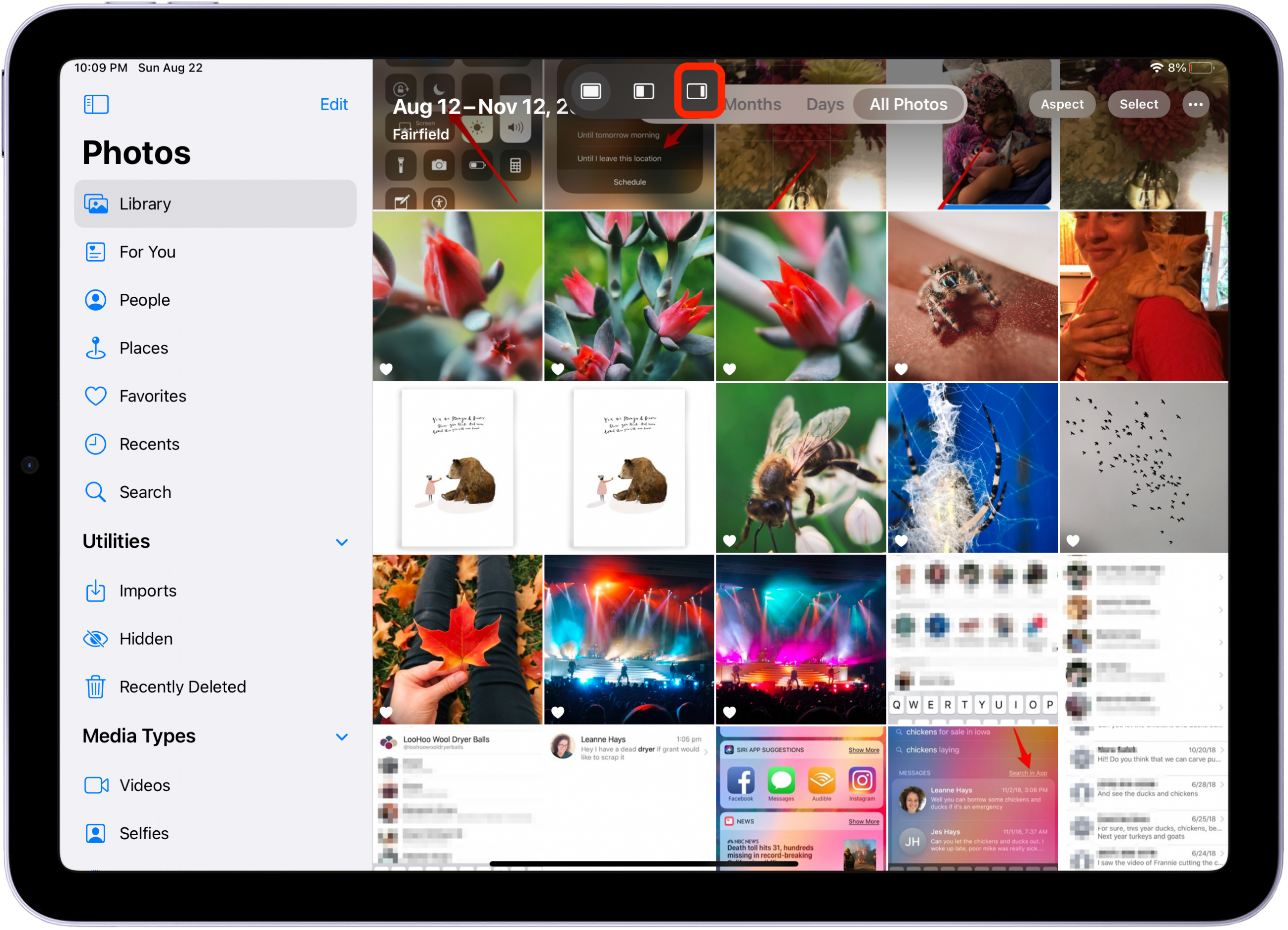 Another basic Multitasking iPad tool is Drag & Drop. This feature allows you to skip the process of sharing a piece of content to another app. Instead, you can drag files, photos, apps, text selections, and reminders from one app and drop them into another. For example, instead of selecting an image in the Photos app and then sharing it to the Messages app, you can drag the picture from the Photos app directly into a text message. It's easiest to use Drag & Drop in iPad Split View, but you can also use it in Slide Over.