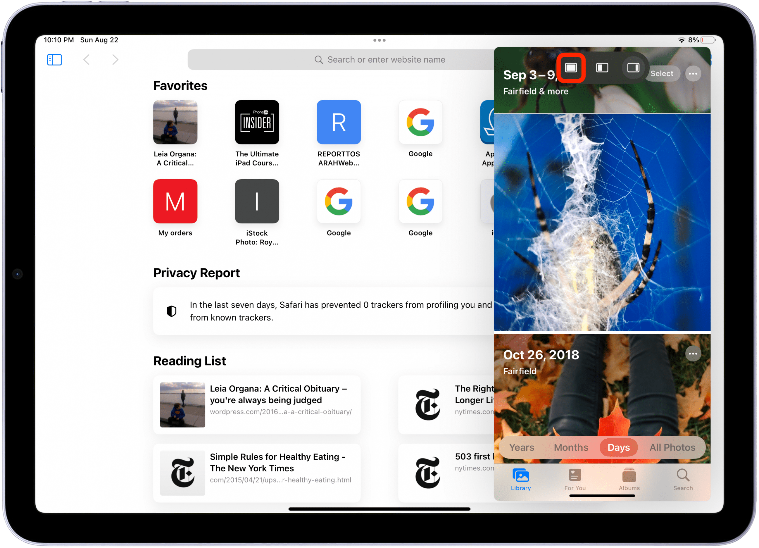 Split View is probably the most useful of the multitasking features, letting you use two apps simultaneously whether you’re in horizontal or vertical screen orientation. You can use Split View with most of Apple’s stock apps and with many popular third-party apps, such as the Microsoft Office apps for iPad. When an app is compatible with Split View, you’ll see three grey dots at the top of the screen. This is the multitasking icon. Follow the steps below to learn how to use this multitasking feature.