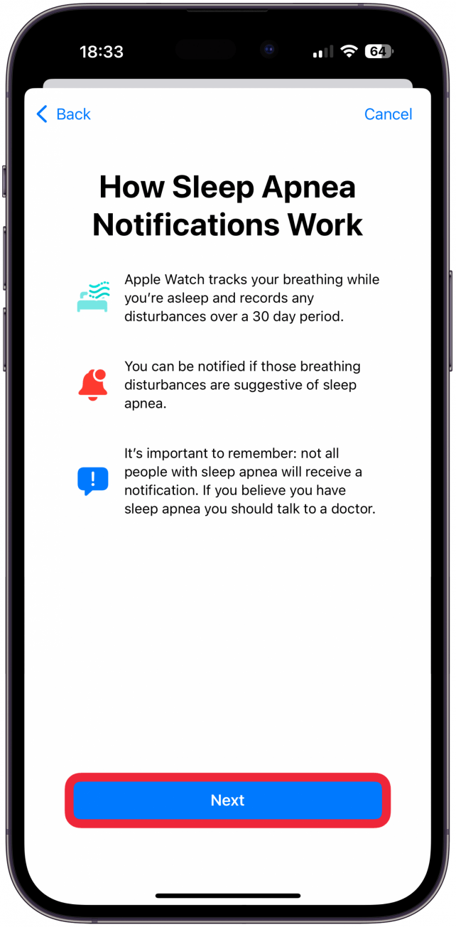 - Scroll down until you see Sleep Apnea Notifications, tap Set Up.