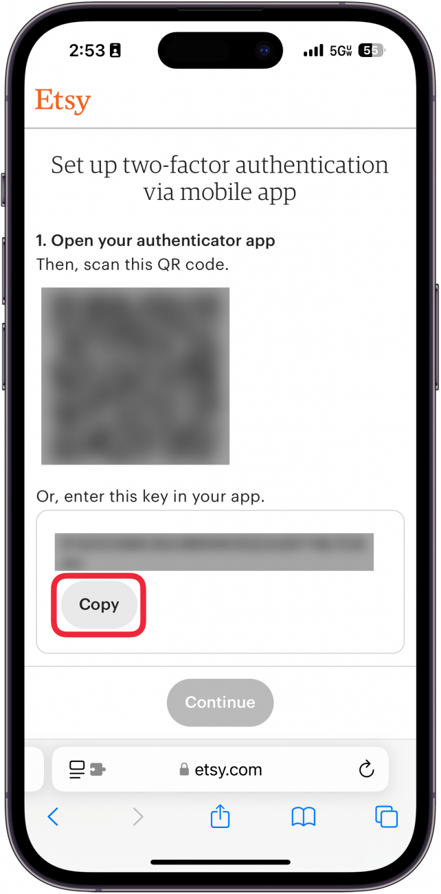 - The site will display a QR code, as well as a setup key. Keep these on hand as you proceed. If you are doing this all on your iPhone, tap Copy to copy the setup key to your clipboard.