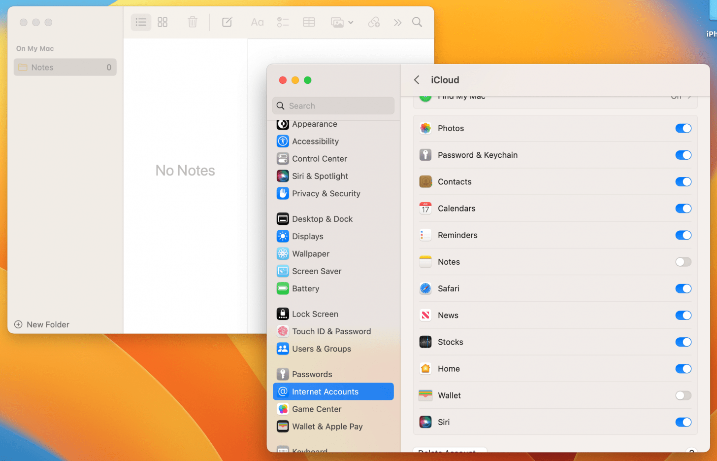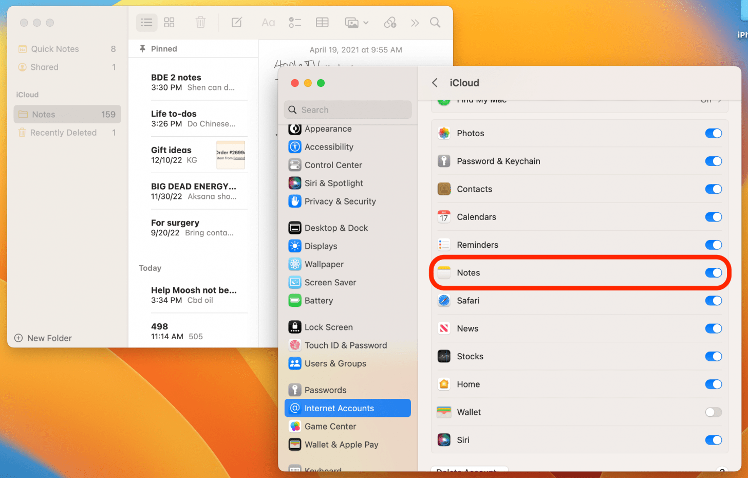 - Toggle Notes back on. All your notes will begin to come back. The process may take a minute or two.
