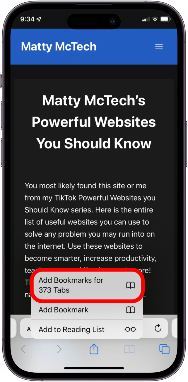 - Tap Add Bookmarks for [X] Tabs. The X represents the number of tabs.