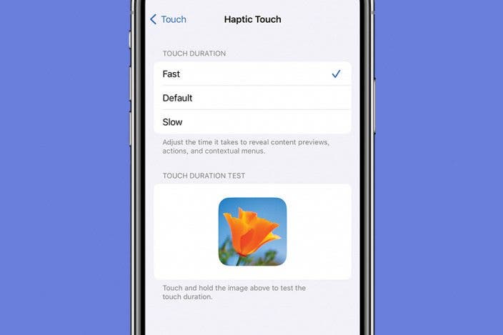- Under Touch Duration, you can choose between Fast, Default, and Slow. Fast makes it so you only need to touch and hold something for a split second before Haptic Touch activates. Default is slightly slower, taking about a half second, and Slow takes a little more than a full second before it activates.