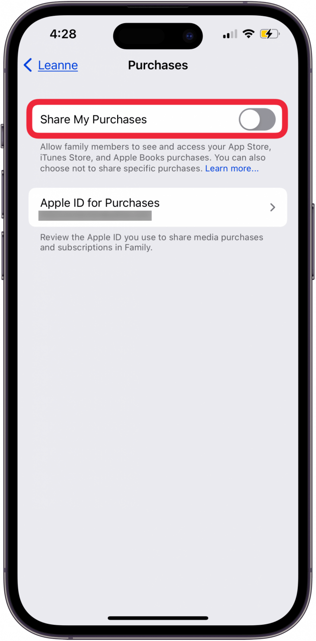 - If you want to hide subscriptions from family members in your Family Sharing group, open the Settings app, tap Family, your name, and toggle off Share My Purchases.