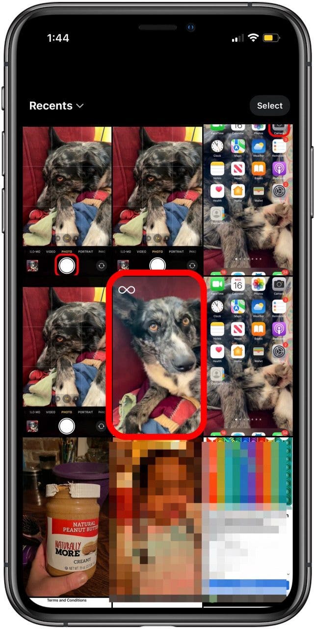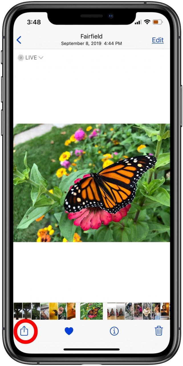 - Find and tap the Live Photo you want to share. A Live Photo will have the word Live in the top left corner of the photo.