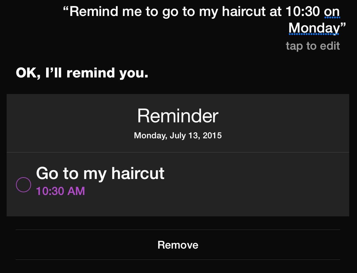 To ensure that you get a Reminder, begin your request by using the verb "remind," such as "Remind me at 10:30 on Monday to go to my haricut." Siri will reply, "OK, I'll remind you" and will show you your reminder.