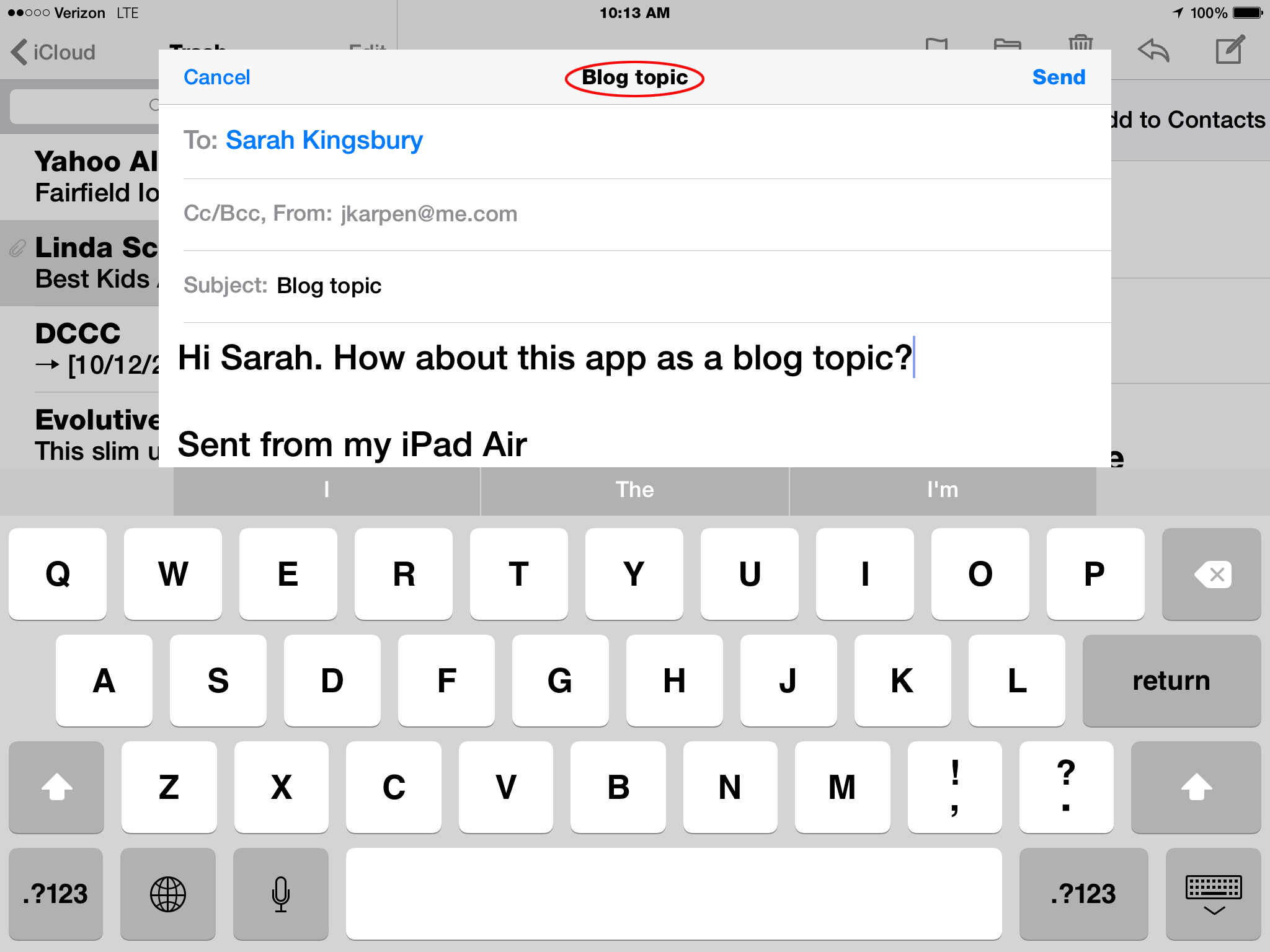 In the screenshot below I'm working on an email to Sarah, our blog editor, that I've given the subject heading "Blog topic." But then I need to see more detail about the app that I'm referring to in the email.