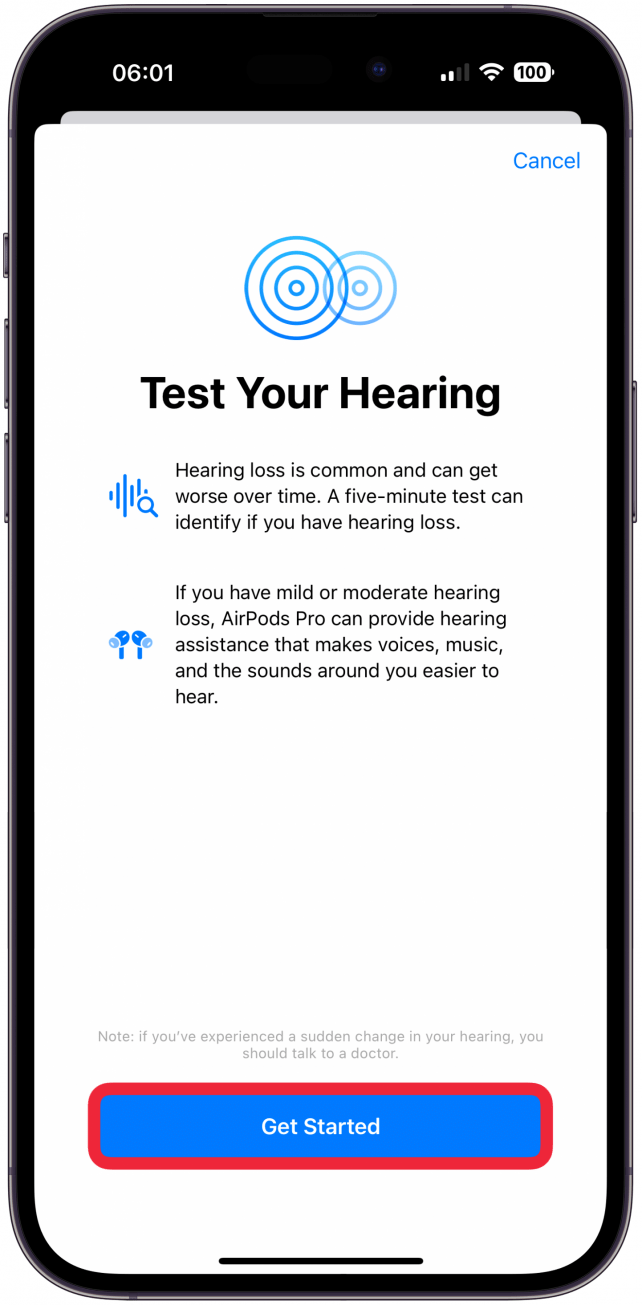 4. You will see some information about this particular hearing test and what your AirPods can do for you. Once you are ready, tap Get Started.