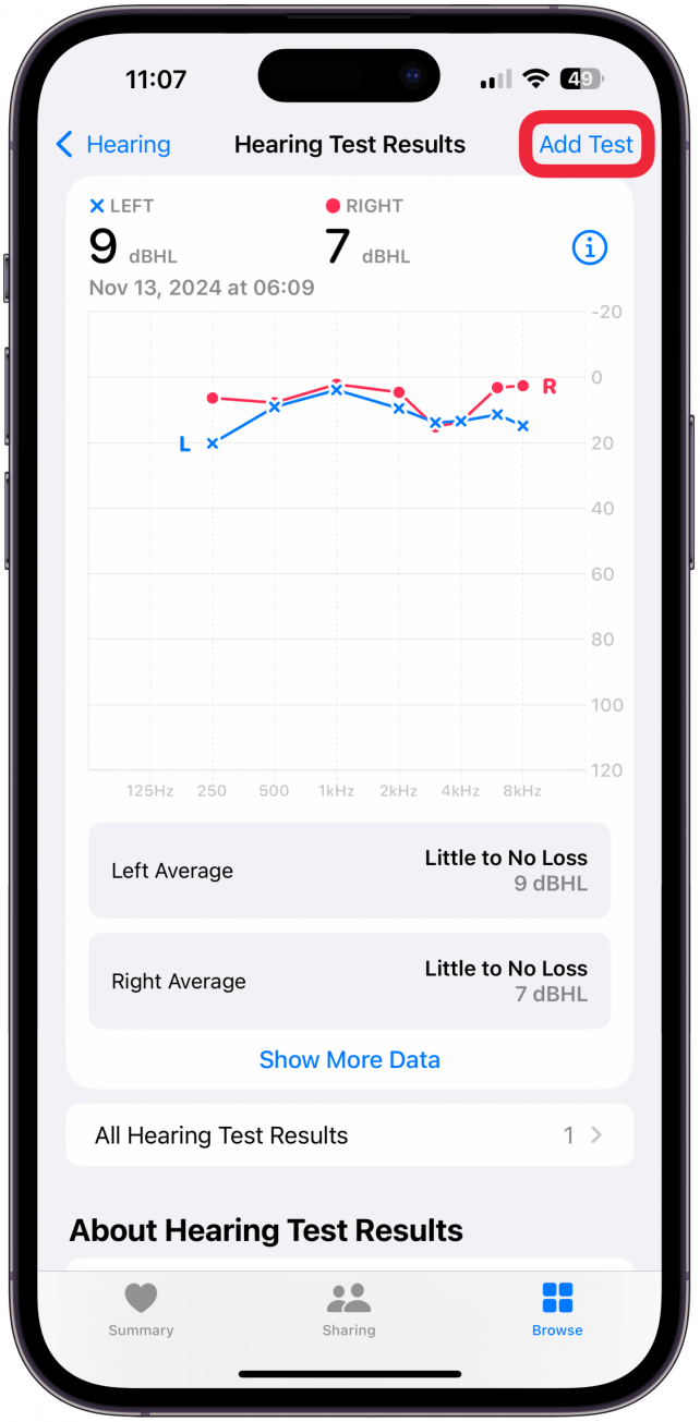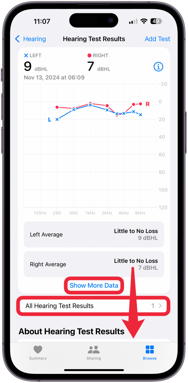 3. You will see the results on the page. Tap on Hearing Test Results to get more information.