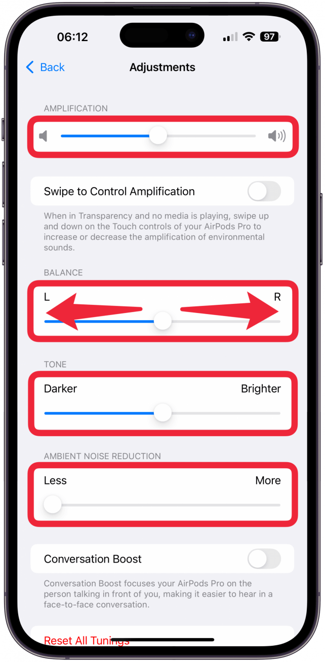 3. Here, you can alter the amplification, balance, tone, and ambient noise reduction, and you can toggle on Conversation Boost to help you hear in-person conversations.