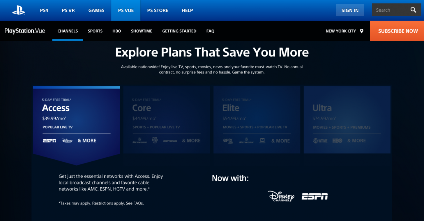 You don't need a PlayStation to subscribe to PlayStation Vue, a live-streaming TV service that includes cloud DVR and the ability to stream on five devices at once. The least expensive package, Access, includes ESPN and rings in at $44.99 a month.