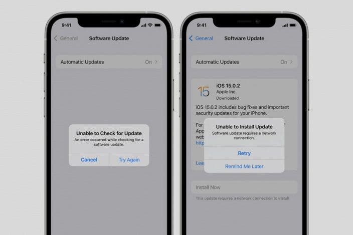 What happens if you get an "Unable to Check for Update. An error occurred while checking for a software update.", or "Unable to Install Update. Software update requires a network connection" message? In this case, tap Try Again or Retry to try and update your iPad or iPhone using your same Wi-Fi network. If you get the same error message, try using a different Wi-Fi network. If you are still unable to check for an update on your iPhone or iPad, wait a while before trying again, in case Apple's servers are overloaded with so many people trying to update their devices at once.