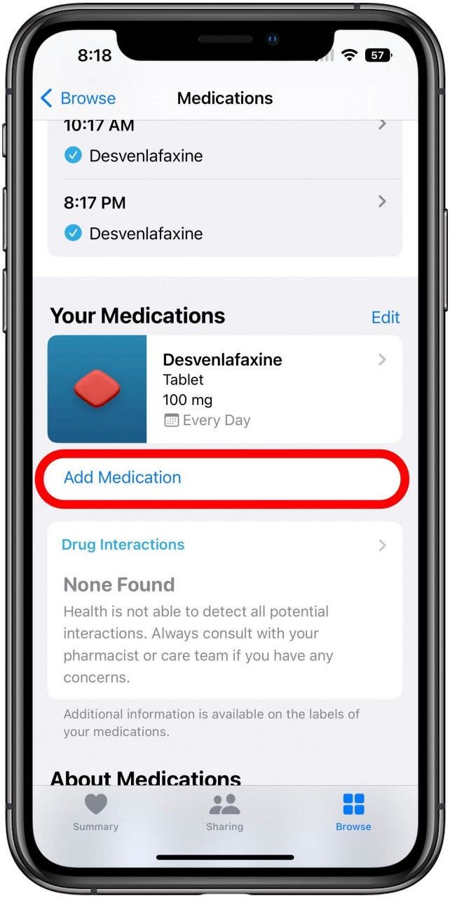- Once the medication has been added, you'll be returned to the Medications screen. If there are potentially concerning interactions, you'll see it in the Drug Interactions box below the Add Medication button. Just tap this box for more detailed information.