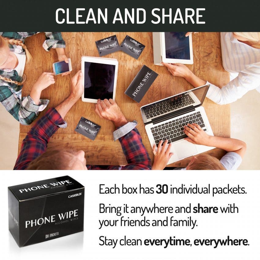 CASEBUDi's phone wipes contain 70% Isopropyl Alcohol, which can safely clean your entire phone, including its sensitive touchscreen. You can even use them to sanitize your other electronics. They are individually packaged to keep them squeaky clean and compact for use on-the-go. All 30 5" x 8" wipes are conveniently folded into a $6.99 box that will last you an entire month.
