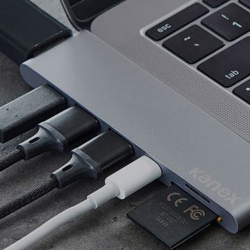 I use a MacBook Pro at work and a different one at home, and I use multiple monitors and other accessories in both places, so I'm always looking for the ideal docking hub. Kanex sent me the iAdapt 7-in-1 Multiport USB-C Hub + Card Reader ($79.95) to try. For users like me, it's a great addition. I specify users like me, because it does require a MacBook Pro with two adjacent USB-C ports. It simply won't fit on other Macbooks. Indeed it plugs in to those two slots and essentially become a part of the MacBook Pro.