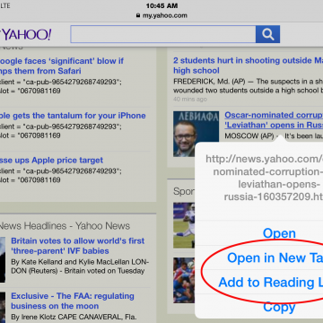 Anytime you see a link in Safari or Mail, you can tap and hold it to reveal options beyond simply opening the new page. I constantly use this feature when I'm looking at the news in my personalized Yahoo page. If I see a news story I want to read, I tap and hold the link so that the page opens in a separate tab. That way I can quickly go back to the original Yahoo page without having to use the back arrow and waiting for the page to reload. The options in Safari also included adding the linked page to your Reading List. Tapping and holding a link in Mail also gives you the option of adding the page to your reading list as well as opening the page in Safari. Finally, the options include copying the link so you can paste it elsewhere.
