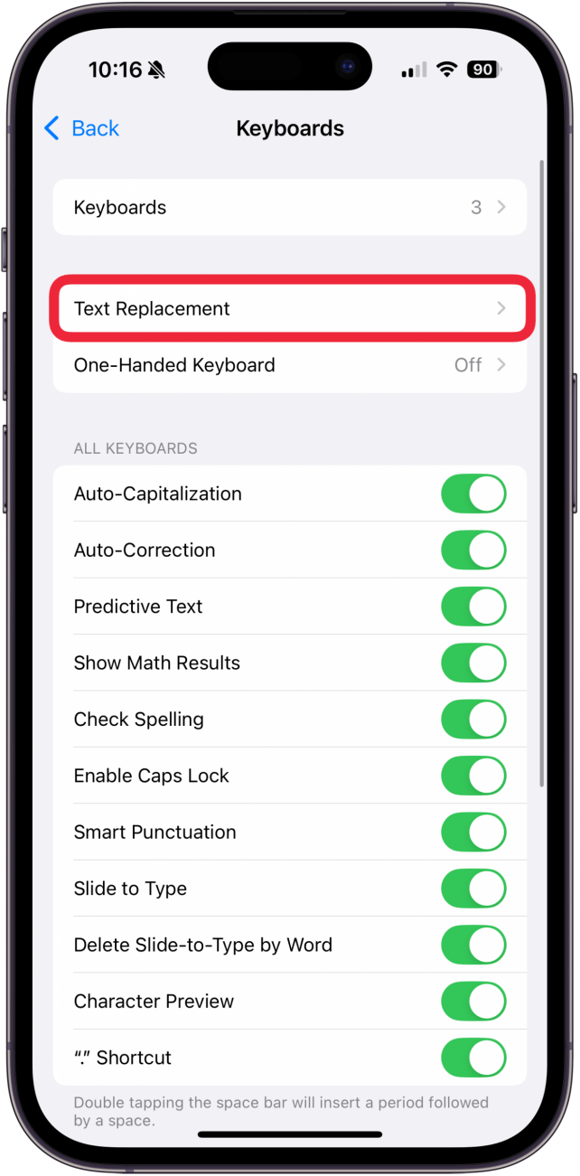 - Tap Text Replacement.