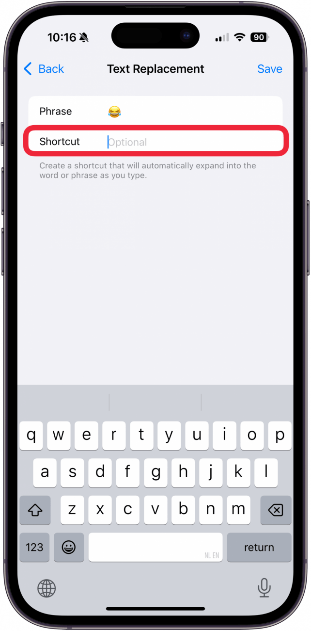 - In the Shortcut field, add the text shortcut you want to turn into an emoji.