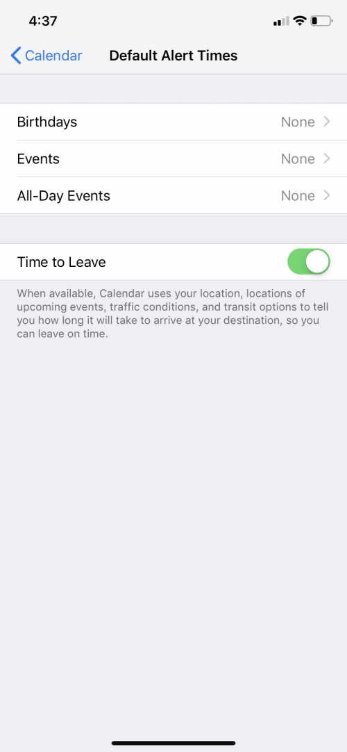 - Tap Default Alert Times. Here you can choose the default alert times you’d like for Birthdays, Events, and All-Day Events.