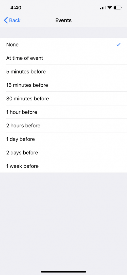 - For Events you can choose to be reminded up to one week before or as soon as the time of the event.