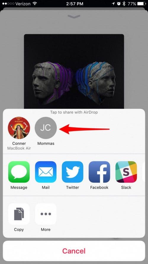 Airdrop can only be used if someone is near you, so if you're trying to send a song to someone down the street or across the country, you'll need to share the song via Messages or Mail instead. To Airdrop a song from Apple Music: