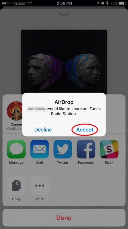 On their iPhone, it will alert them that you are trying to share music with them. To hear the song you’ve sent, they need to tap Accept.