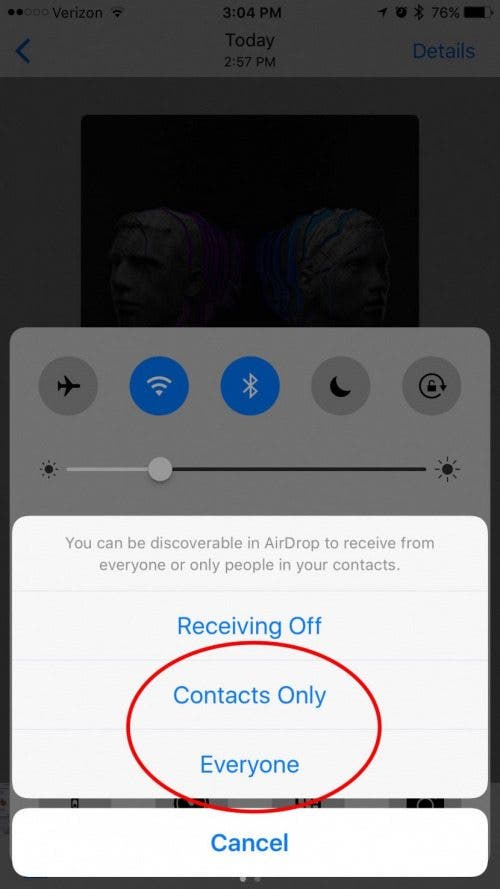 Swipe up from Home screen to open Control Center. Tap Airdrop and select either Contacts Only or Everyone. This will turn on Airdrop (both the sending and receiving iPhone need to have Airdrop turned on).