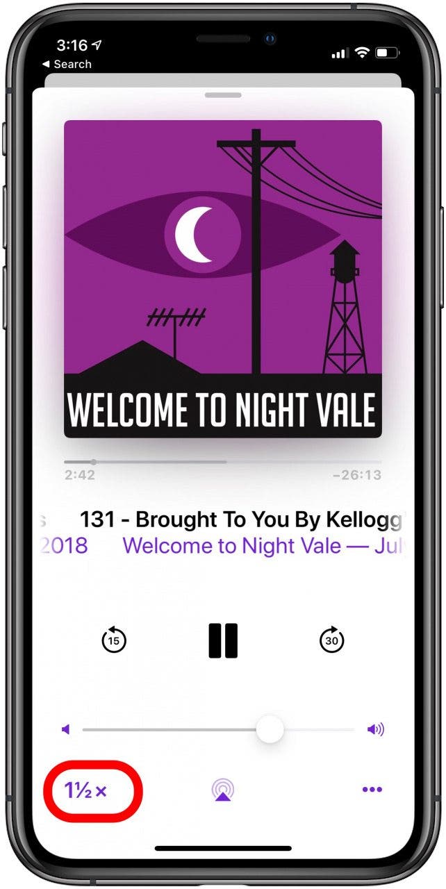 - Locate the 1x on the podcast play screen.
