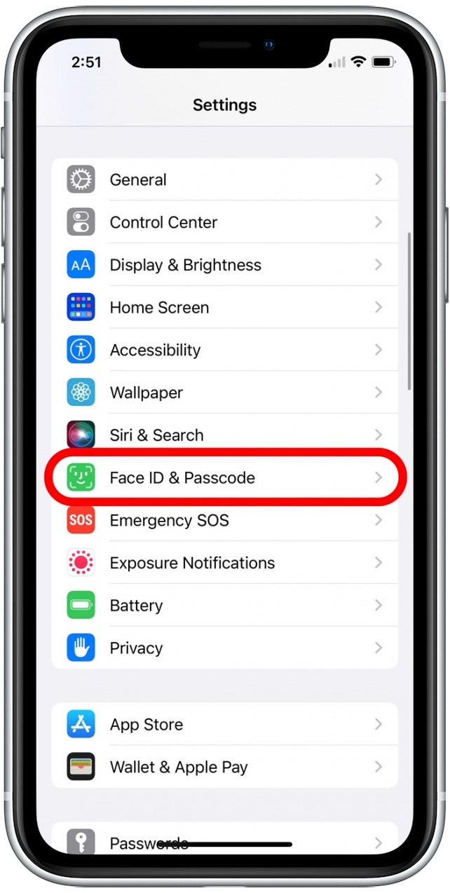- Select Face ID & Passcode (or Touch ID & Passcode for iPhones with a Home button).