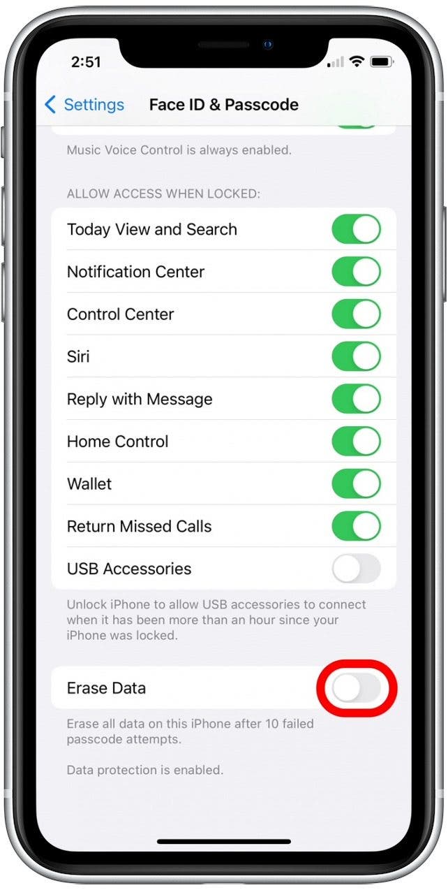 - Scroll down and tap the Erase Data toggle.