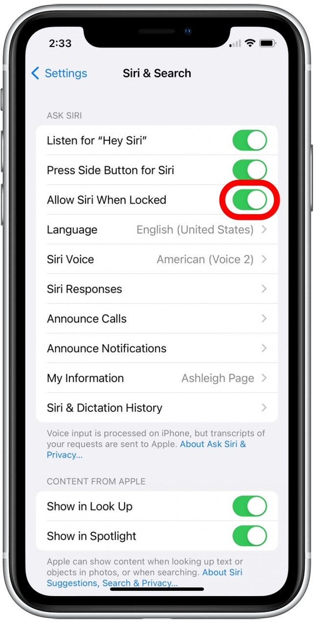 - Tap to disable the Allow Siri When Locked toggle.