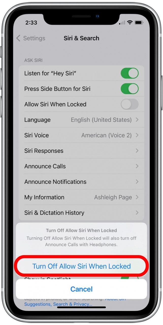 - To confirm, tap Turn Off Allow Siri When Locked.
