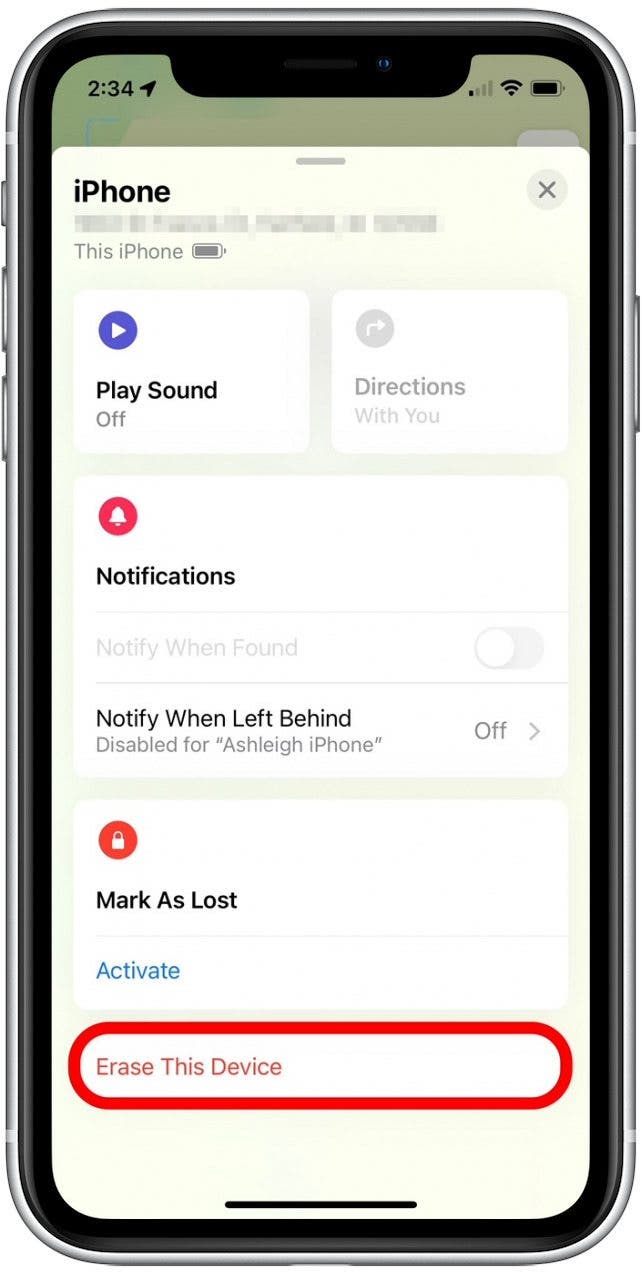 - Scroll down to the bottom and tap Erase This Device.
