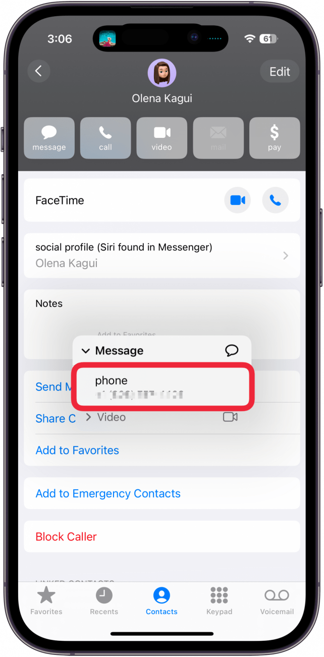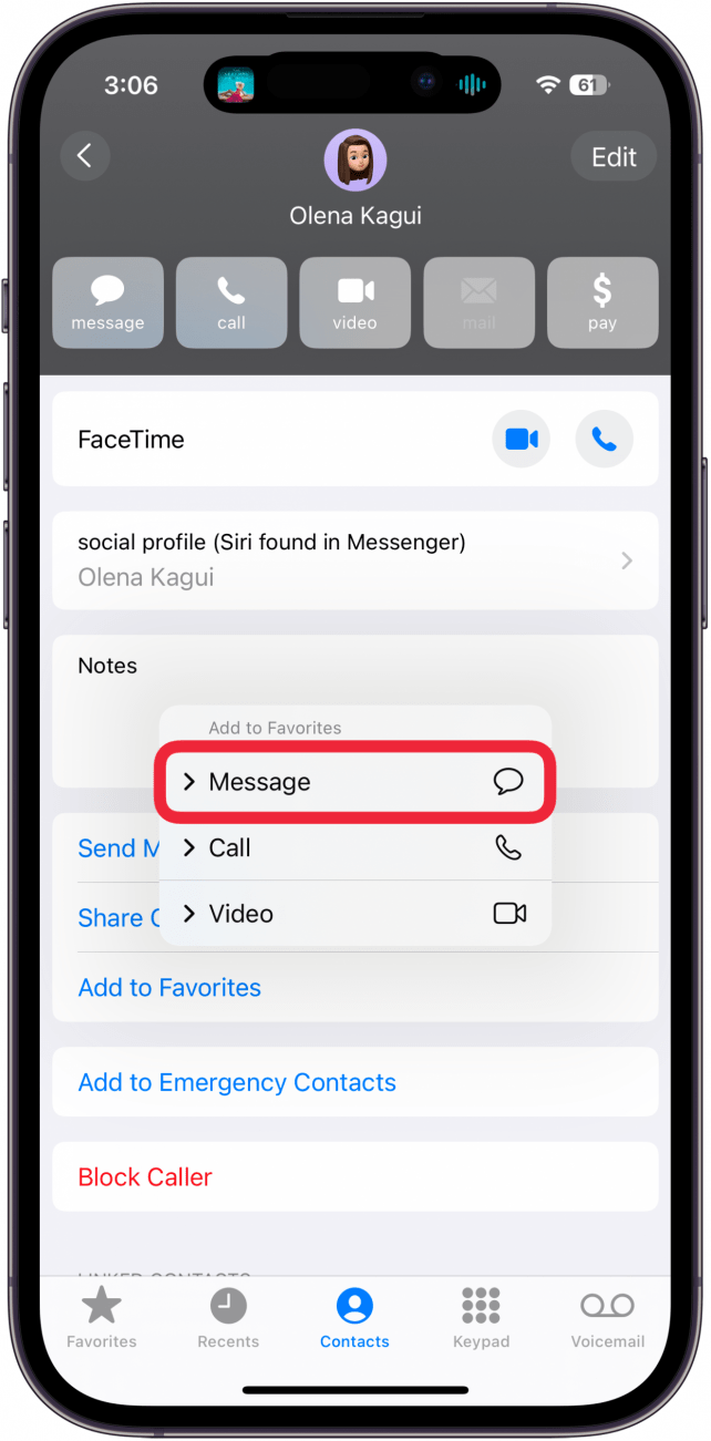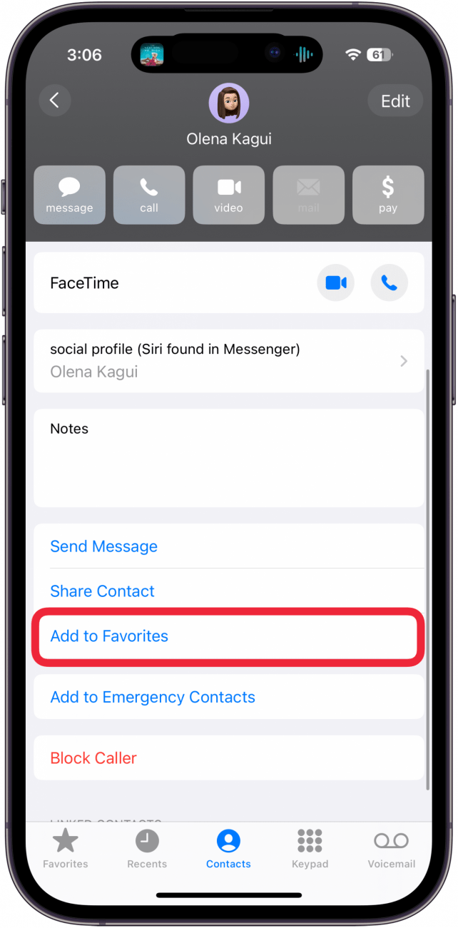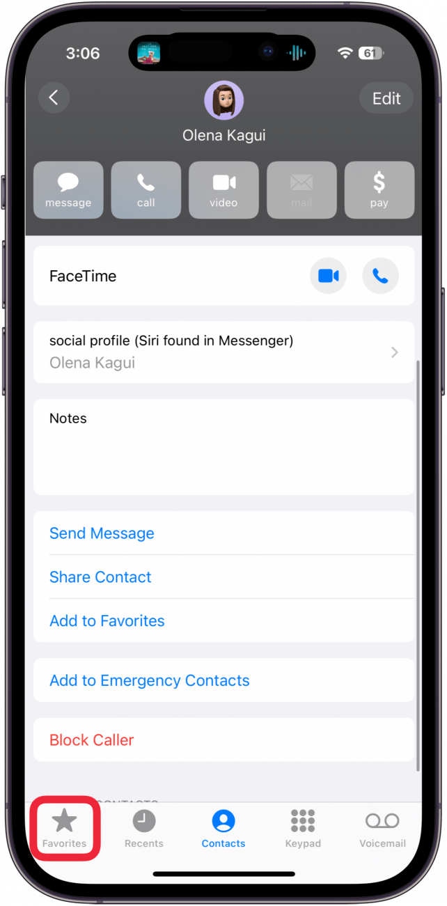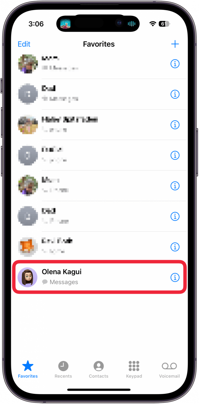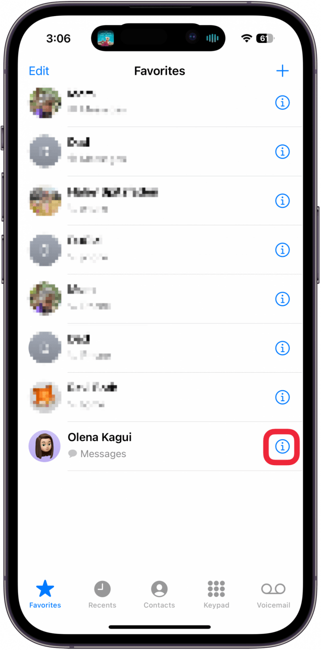 - You can tap the info icon to open the contact card for your Favorite contact.