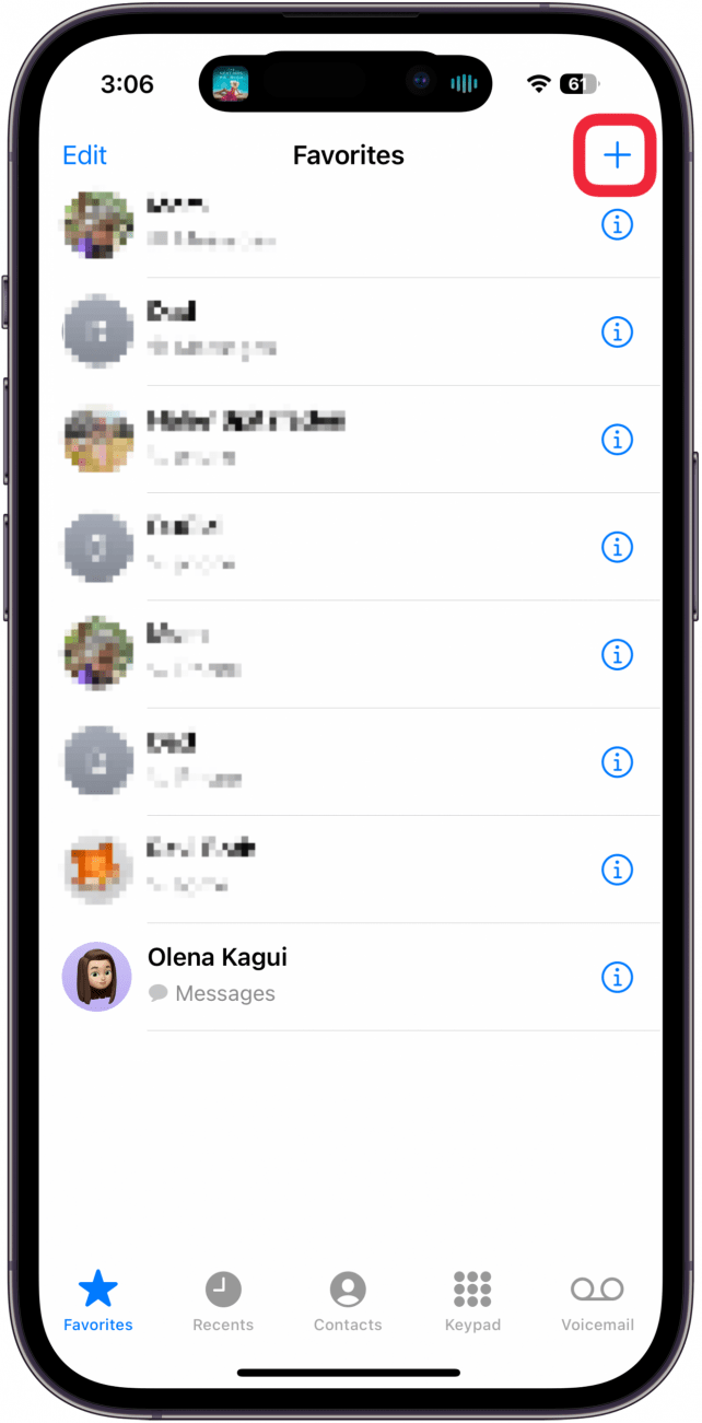 - You can also tap the plus icon on this screen to add contacts to your Favorites list. The process is essentially the same as the steps above, except you won't need to open the contact card.
