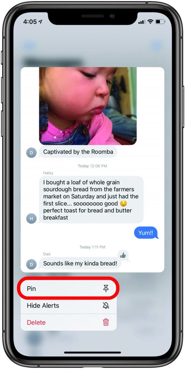 Even though I text my family chat every day, it can still get bumped down on my list of messages by other texts. Starting with iOS 14, you can pin your favorite conversations to the top of your message list to keep it visible. All you have to do is long press on the conversation of your choice, whether it’s a group message or a one-on-one chat, and tap Pin from the menu that comes up. You can pin many conversations, so if you have a few text chains you want easy access to, you’re in luck! If you want to unpin, just long press on the pinned message, then tap Unpin.