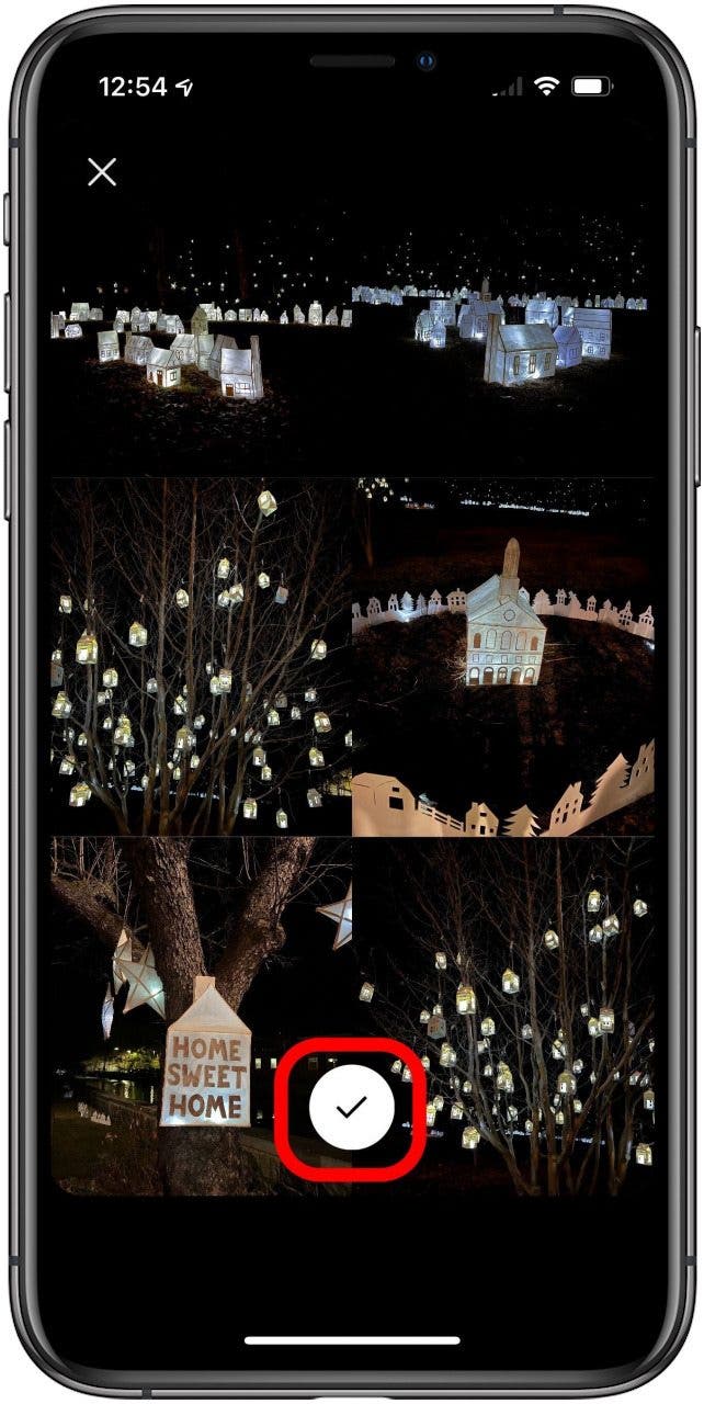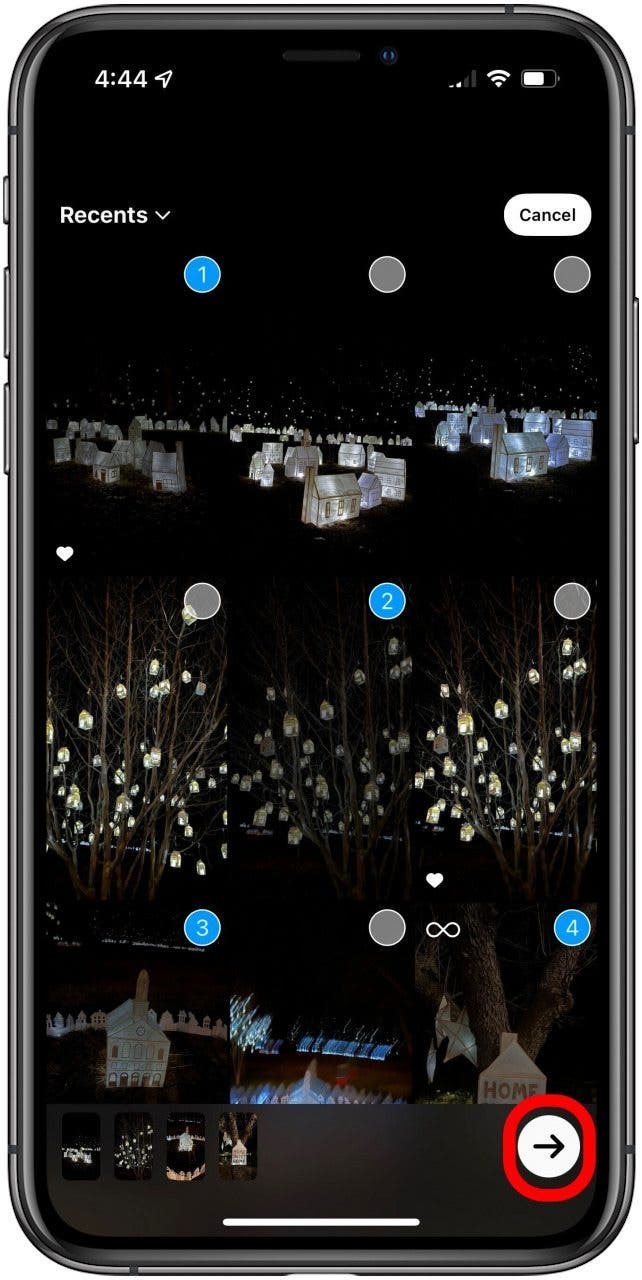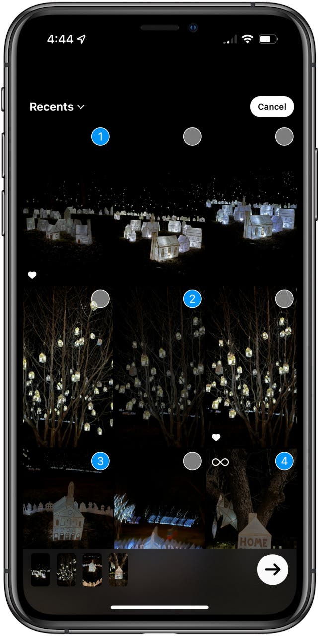 - Tap the photos you want to include, then tap the arrow on the bottom right of your screen.