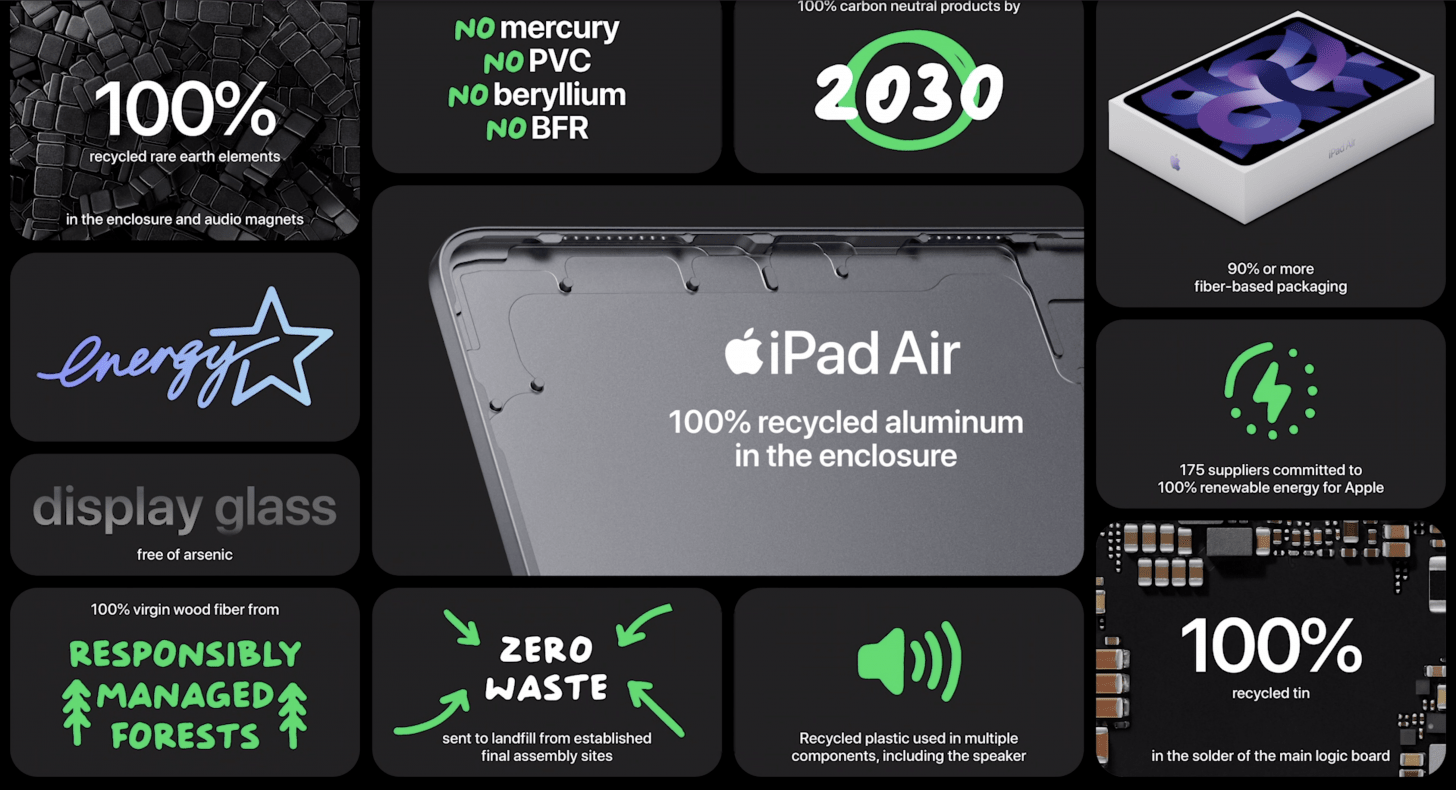 I'm pleased to see Apple shifting into more eco-friendly options wherever possible, and this latest iPad Air represents a commitment to sustainability. The iPad Air features a 100 percent recycled aluminum enclosure, 100 percent recycled tin in the solder of the main logic board, and 100 percent recycled rare earth elements in the enclosure and audio magnets. Each of these recycled components meet Apple's standards for energy-efficient operation while remaining free of various harmful substances. This is all part of Apple's larger plan. Today, their global corporate operations are carbon neutral, and by 2030, the plans is to have a net-zero climate impact across the entire business. While recycled components in your iPad might seem like a small step, it is progress, and a step in the right direction.