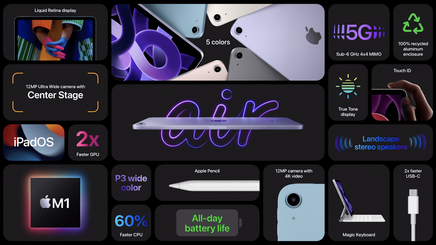 This new iPad Air will be available in an array of pastel hues including space gray, starlight, pink, purple, and blue.