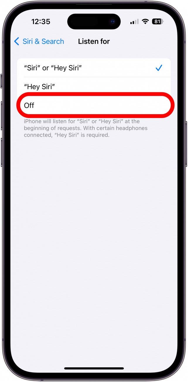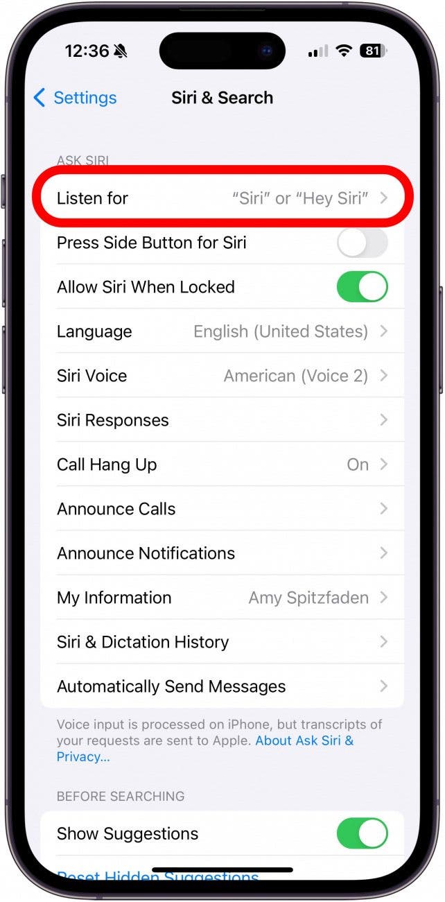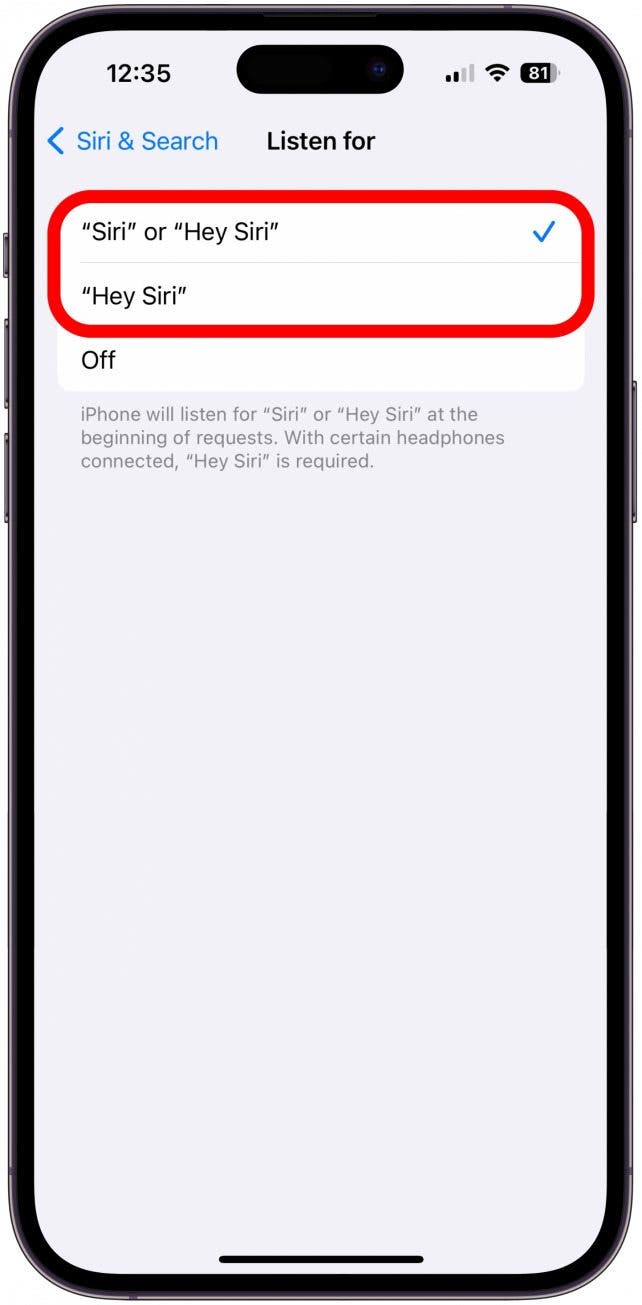 - Go back to Listen for and select "Siri" or "Hey Siri" or "Hey Siri".