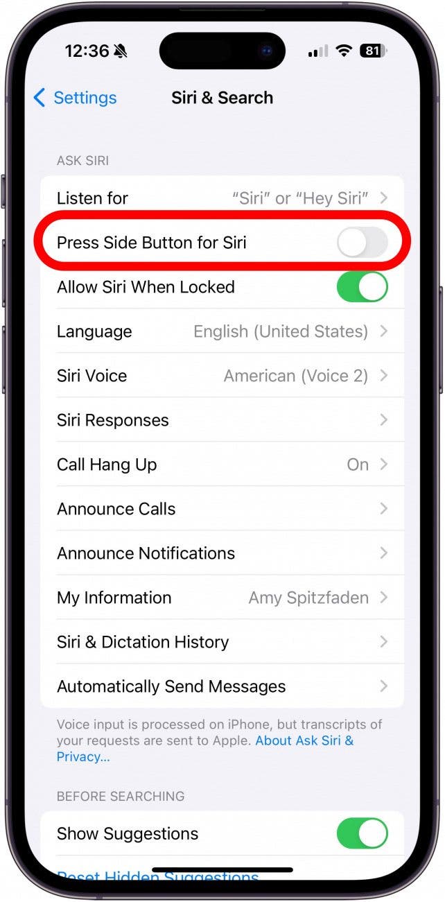 - Select Off, then tap Siri & Search again to return to previous screen.
