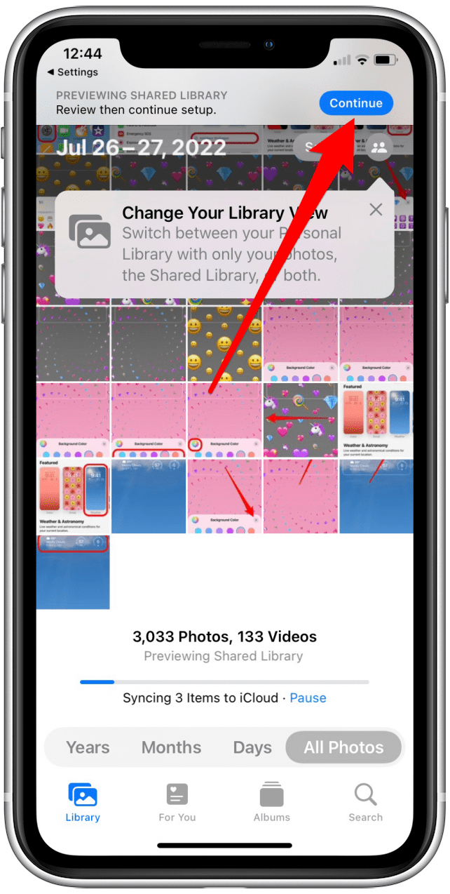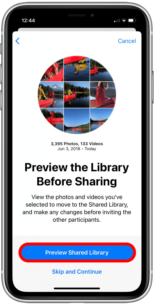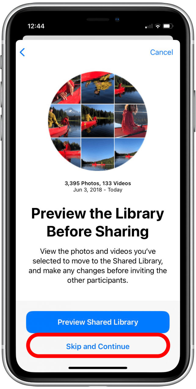 - If desired, you can tap Preview Shared Library to view the photos. If not, tap Skip and Continue.